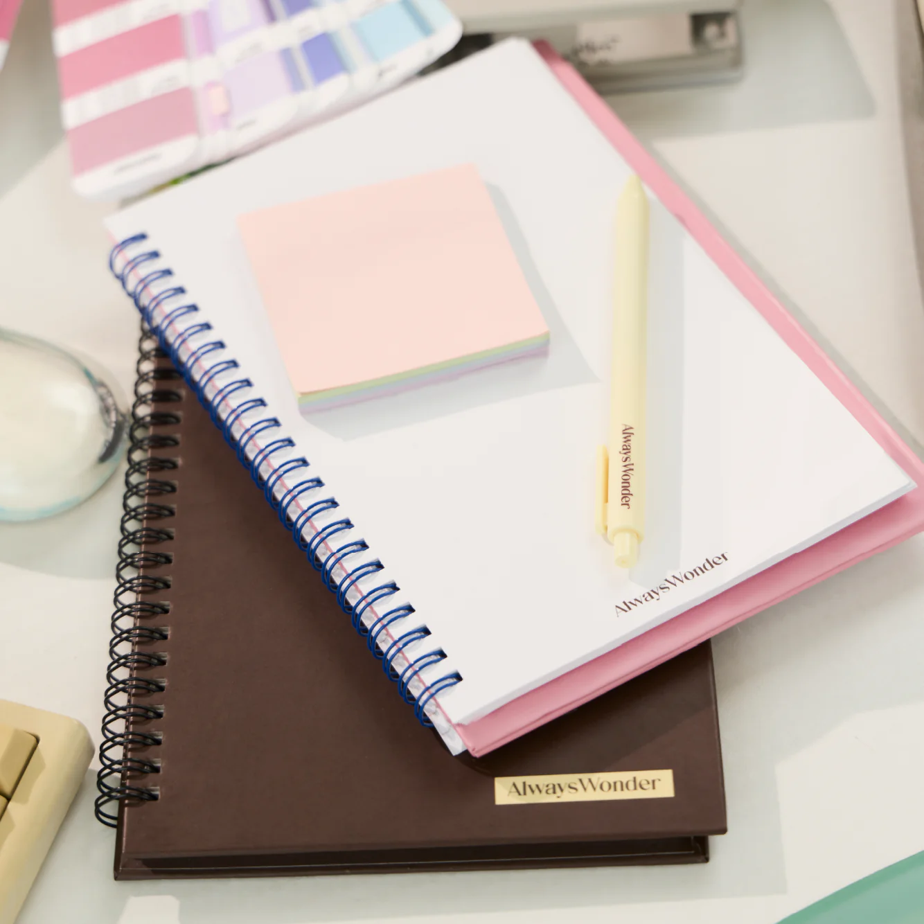 Comes in Two options - hardcover in Rose Pink with Navy ring binding, or Espresso Brown with matching-tone ring binding and logo printed. Both feature the printed logo, and the page include grid and blank formats.