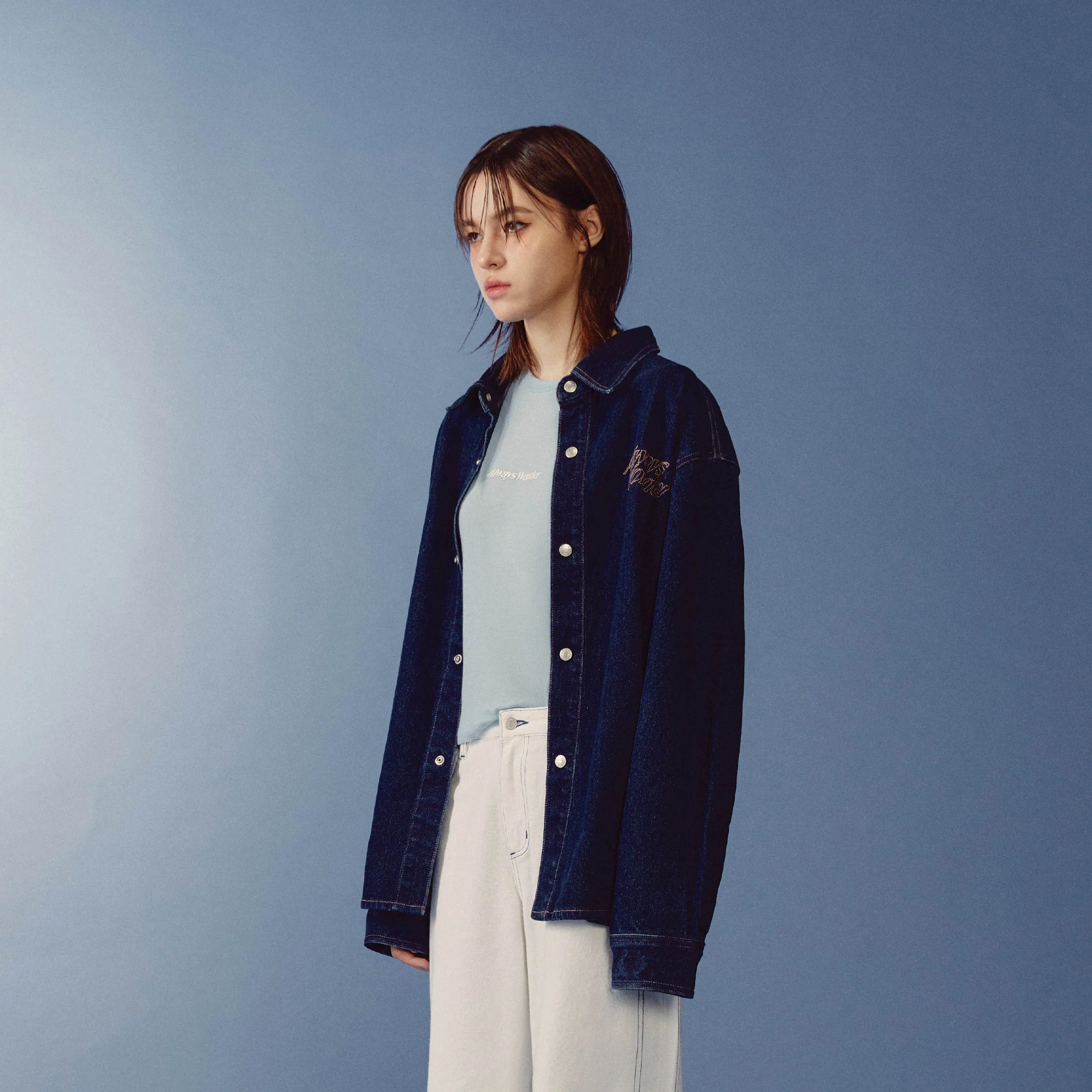 Crafted from lightly washed deep indigo denim, this jacket embodies a sculptural silhouette that balances structure with fluidity. Tailored seams define a refined form, complemented by minimal detailing — a logo embroidery at the chest, a leather logo patch at the back, and logo-embossed buttons that echo the brand’s understated sophistication.